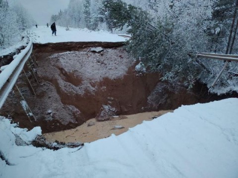 Пишут, что из-за аномальной для декабря погоды поднялся уровень воды в ближайших водоемах и произошел размыв дорожного полотна у водопропускной трубы. Может, изначально геология была сделана абы как, может, надо побольше лесов вокруг вырубить, чтобы вся трасса через болото шла...