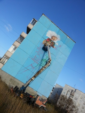 До этого компания раскрашивала фасады в Питере, города Салават. В Северодвинске пока это будет их единственная картина – уже на подходе холода, да и другой такой фасад без окон они не нашли в городе.