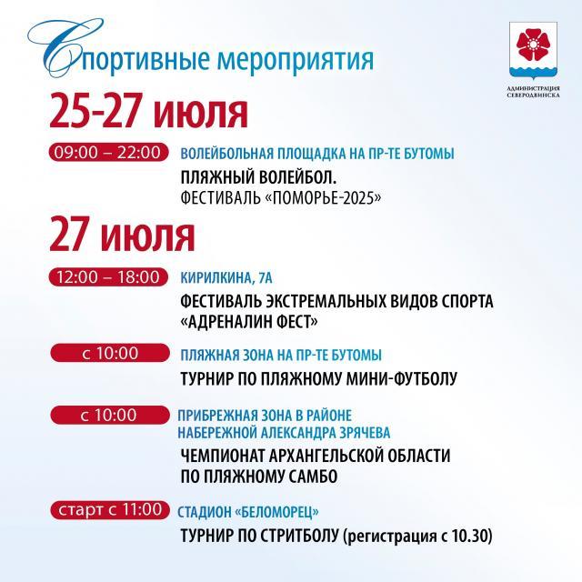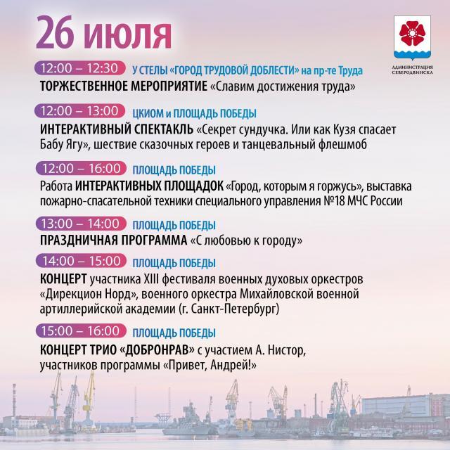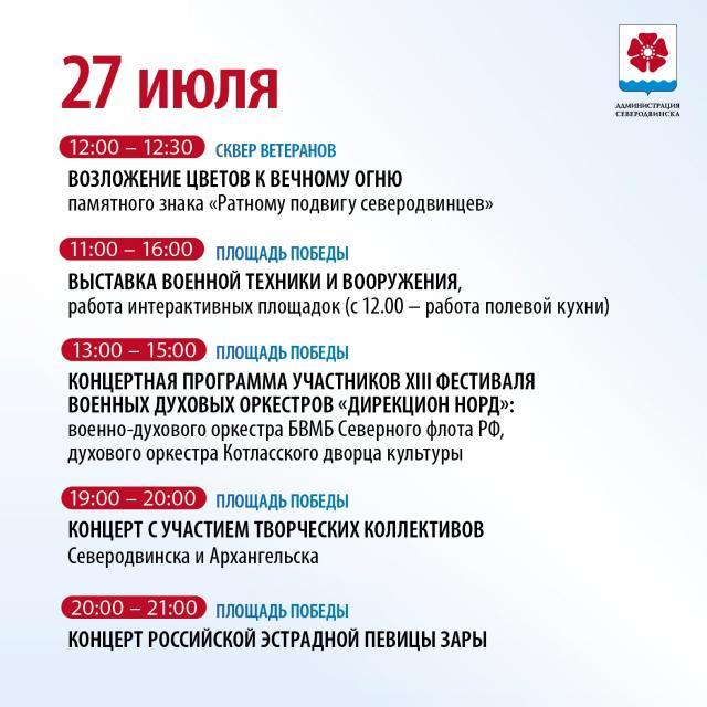 Администрация Северодвинска собрала программу празднования Дня города и Дня ВМФ в карточки-афиши. Не пропустите самое интересное.