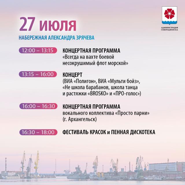 Полная программа празднования Дня города и Дня ВМФ в Северодвинске. Подарок – выступление Зары