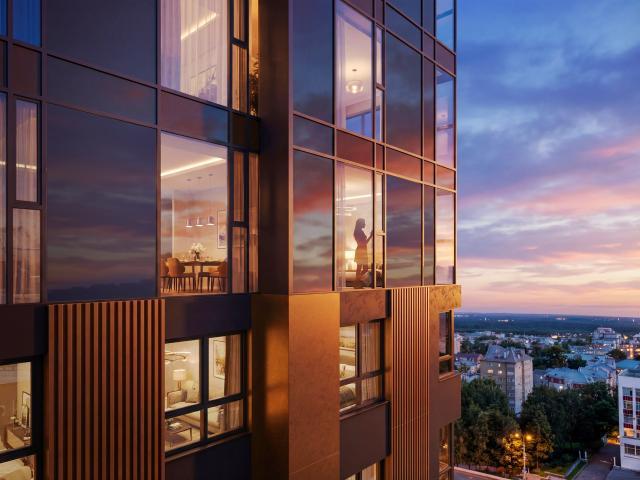 Общее архитектурное решение здания направлено на создание лаконичного выразительного и гармоничного по пластике объекта. Для возведения монолитного каркаса здания используется бетон повышенного качества. Навесные вентилируемые фасады выполняются из современных материалов, по специально разработанному проекту, с учетом ветровых нагрузок на высоте 100 метров. Для остекления оконных и витражных конструкций используются многокамерные энергоэффективные стеклопакеты, имеющие низкоэмиссионные покрытия (i-стекла), что снижает теплопотери через светопрозрачные ограждения.