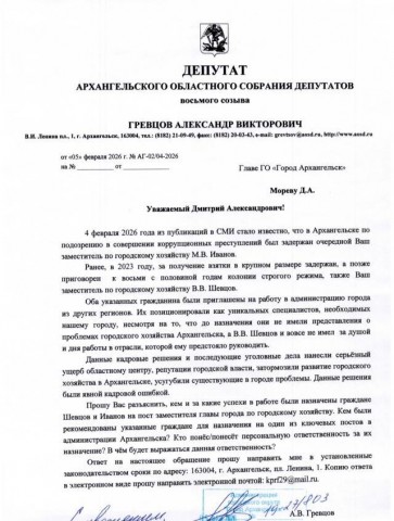 Свое обращения на имя главы Архангельска политик направил сразу после появления информации о задержании заместителя по горхозу Михаила Иванова.