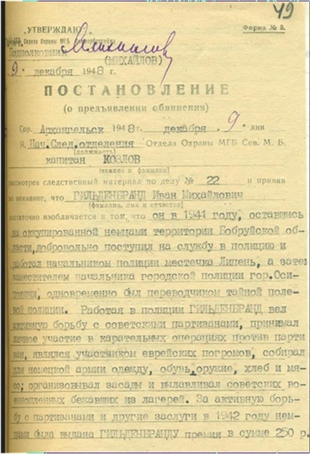 В РУФСБ рассекретили документы, касающиеся одного из участников карательных операций, проводимых фашистами на территории Бобруйской области с июля 1941 года по сентябрь 1943 года. Долгое время предатель Родины – Гильденбранд Иван Михайлович, убивавший соотечественников, скрывался в Поморье.