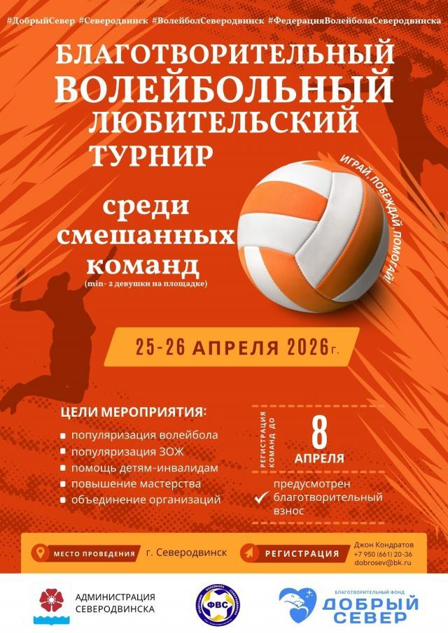 Волейбольный турнир состоится 25-26 апреля, заявку на участие необходимо подать до 8 апреля. Турнир любительский, приглашаются все желающие поиграть и помочь детям с инвалидностью, подопечным фонда «Добрый север».
