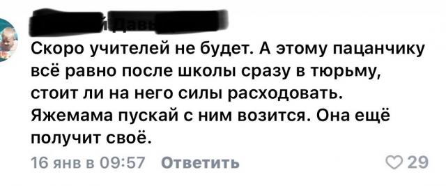 Мне искренне жаль учителя. Вот правда. Для неё тоже стресс, тоже травма, тоже боль.